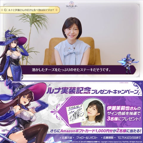 「ルナ」の実装を記念し、ルナ役を演じる声優・伊瀬茉莉也さんのインタビュー動画が公開されています。これに合わせて、伊瀬茉莉也さんのサイン色紙が当たる「フォロー&リポストキャンペーン」も開催中です。