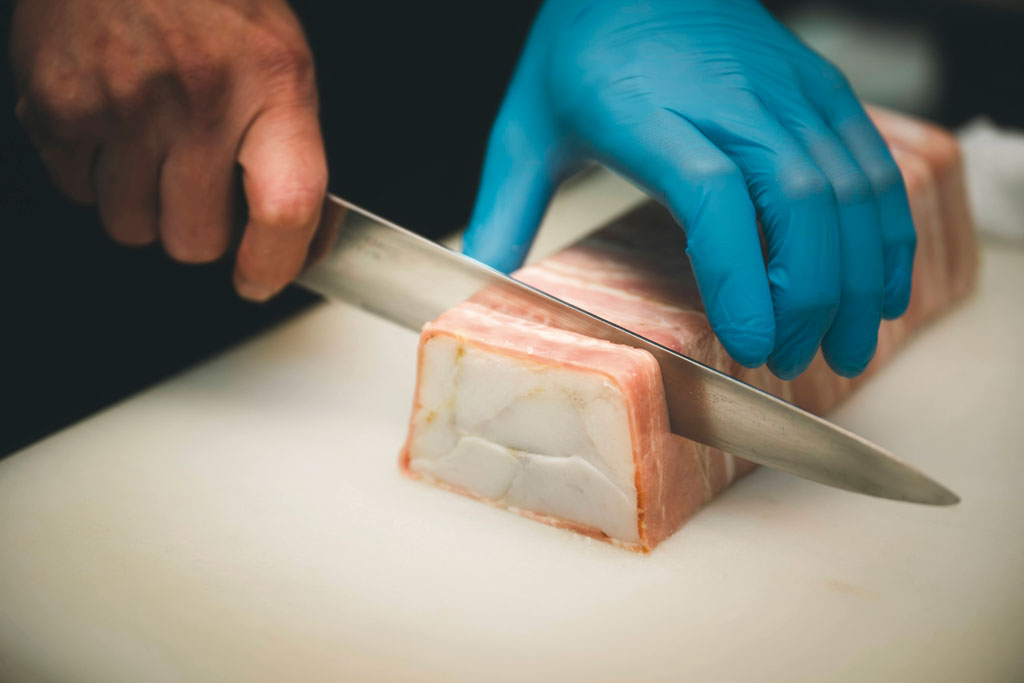 パテ・ド・カンパーニュ 480円。豚肉とレバーと香辛料をゆっくり湯煎で加熱して固めたもの。味が濃厚でワインとの相性がよく、前菜にもピッタリ。
