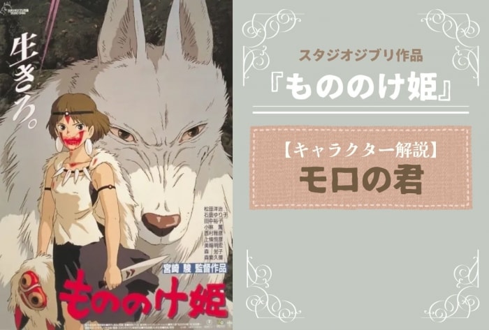 モロの君はシシ神の森を守る、齢300歳の強靱なメスの犬神。高度な知能の持ち主で人語を解します。サンの育ての親であり、母親心を見せる場面も。シシ神の森を侵す人間を憎み、特にエボシ御前には敵意を持って執念深く命を狙っています。齢500歳の鎮西(九州)の猪神・乙事主とは旧知の間柄。