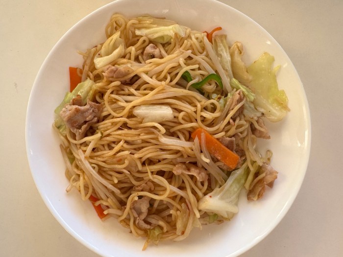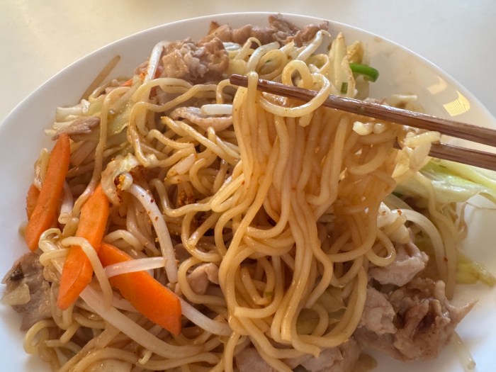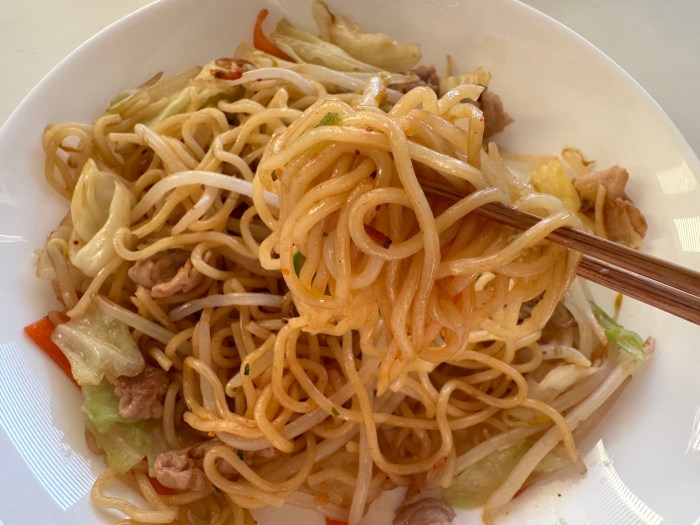 肉と野菜を炒めて麺をほぐし、粉末ソースを混ぜればできあがり。果たしてナンボのもんなのでしょう? いただきま〜す。