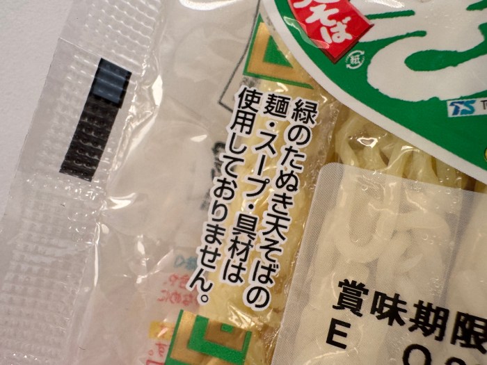 「緑のたぬき天そばの麺・スープ・具材は使用しておりません」と記載されている。 “緑のたぬきを再現した別のもの” という理解でよさそう。