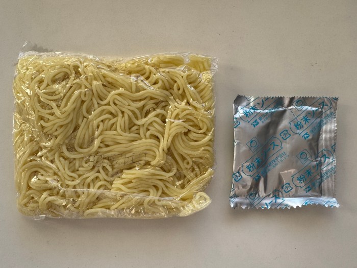 普通のマルちゃん焼そばと同様、中身は蒸した麺と粉末ソースのみ。