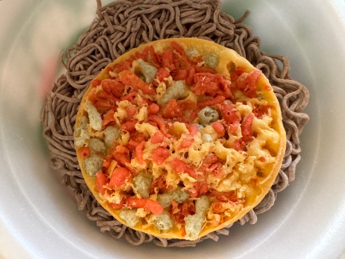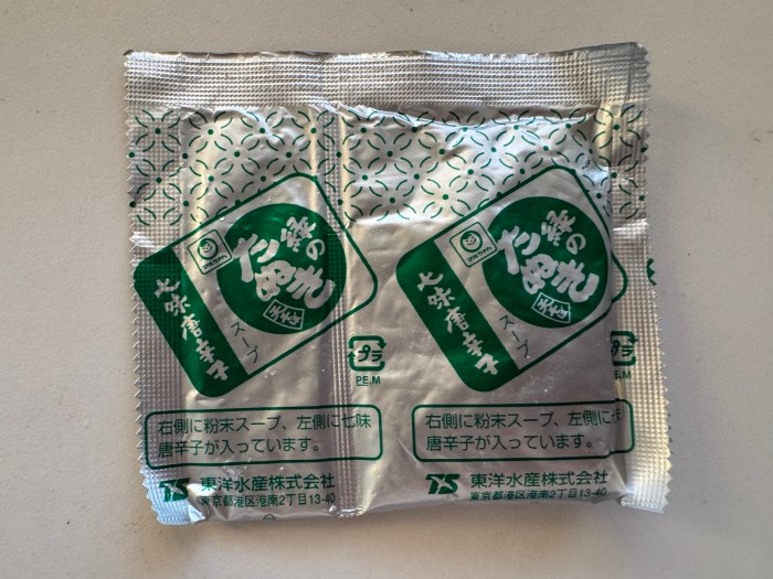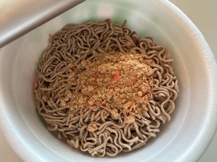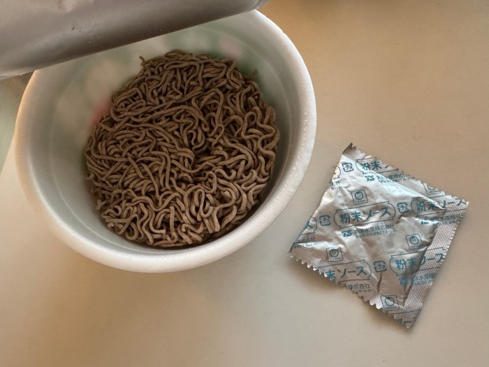粉末ソースの袋を開けると、魚粉のような強いダシの香りが漂った。ソース焼そばでないことは一目瞭然だが、だからといって、この段階で「緑のたぬきですね」とはならない感じ。