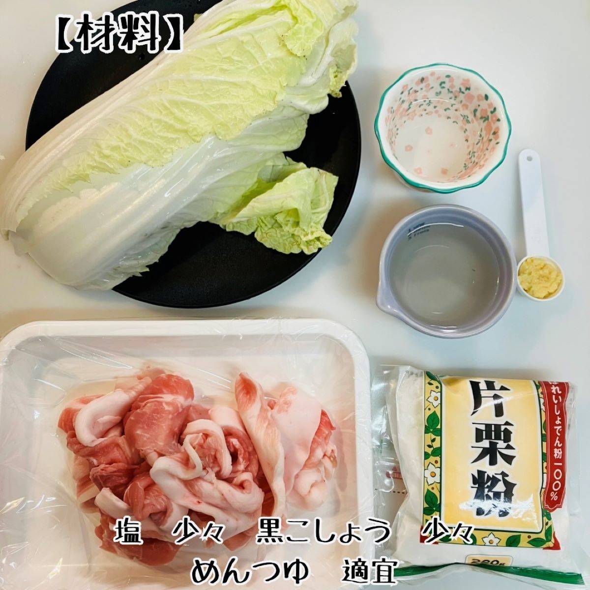 豚肉をのせ、塩・黒こしょうを軽く振りかけ、片栗粉を茶こしで振り入れます。