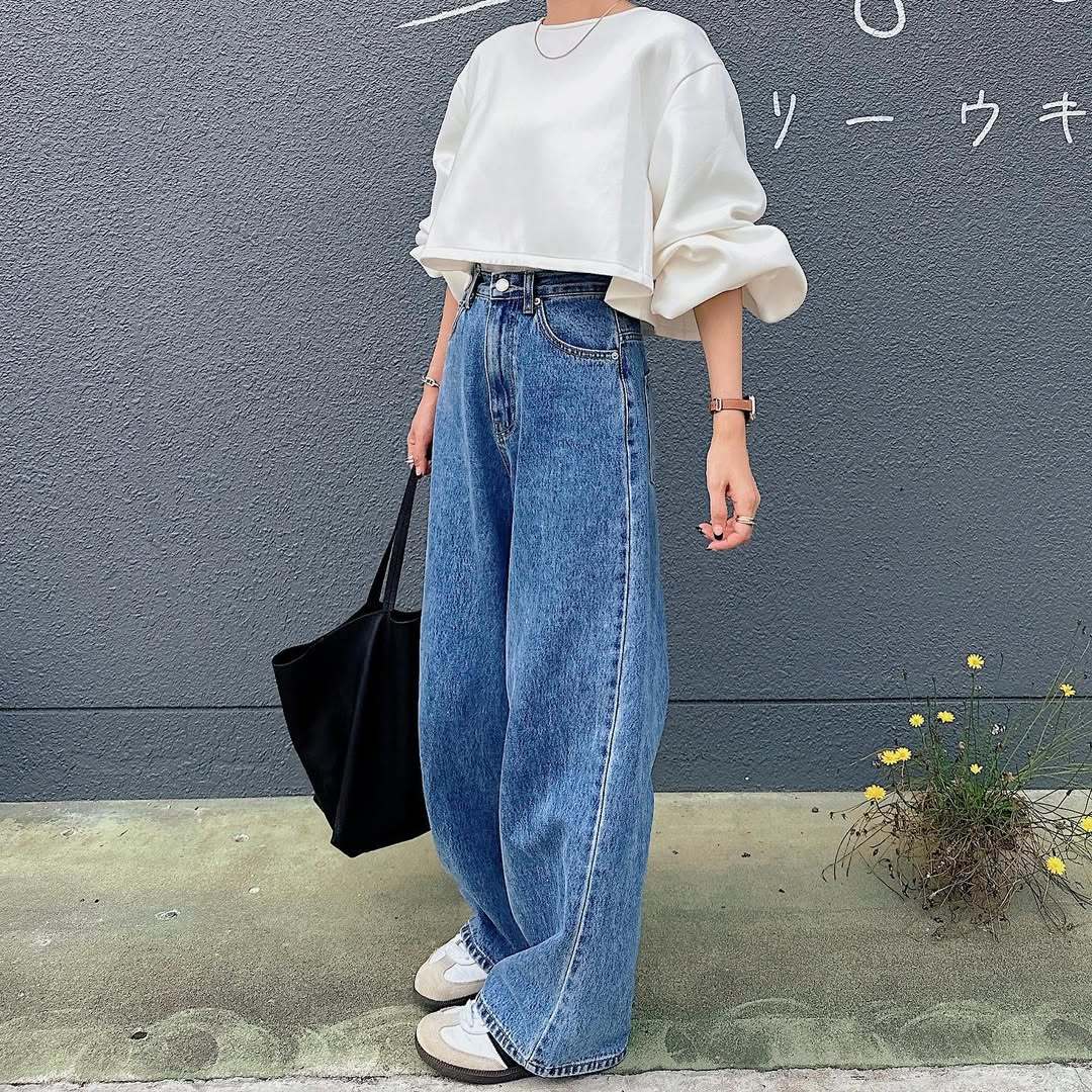 ですが、ショート丈のスウェットトップスなら、部屋着感やだらけ感が出ず、すっきりとした印象になるのでGOOD!