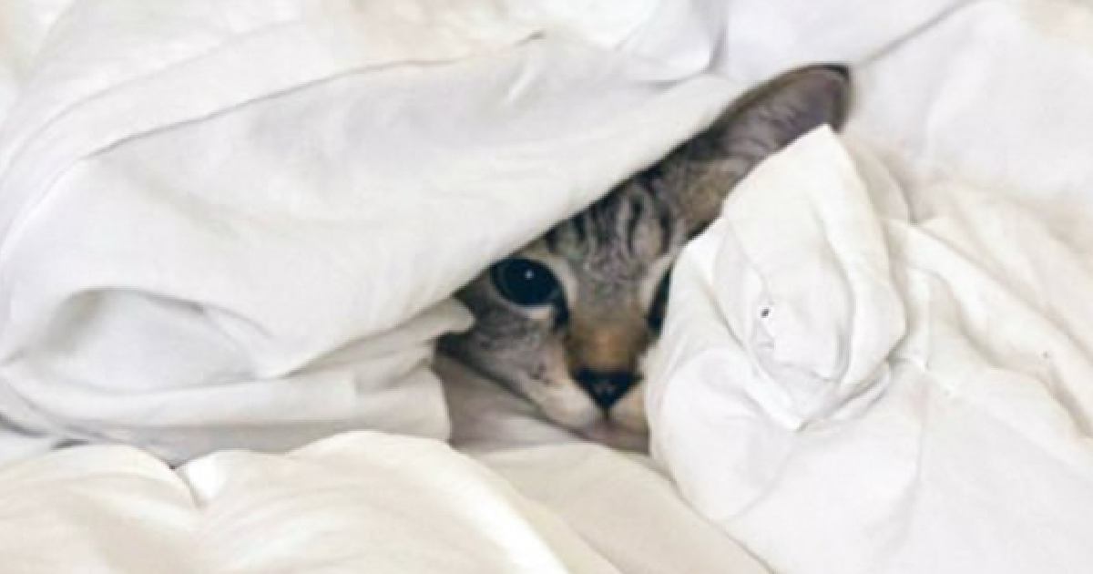 事の発端は、お家の外で鳴り響いた雷。外で雷が鳴り始めた途端、猫ちゃんはビクッと警戒モードに。大きな音と眩しい光に驚いたのか、お布団の中へ潜り込んだそうです。