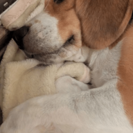 食事は、訓練前、昼、夜に少量ずつ3回。午後からは昼寝したり、庭で遊んだり、同居する猫とまったり過ごしたり。夜は浅利さんと一緒に寝ている。