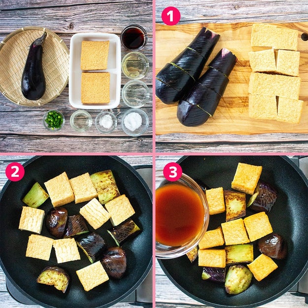 ① なすはヘタを切り落とし、縦半分に切って皮目に斜めの切り込みを入れ、さらに4等分に切る。水に5分ほど浸してあくを抜き、水気をしっかり切る。絹厚揚げは4等分に切る。