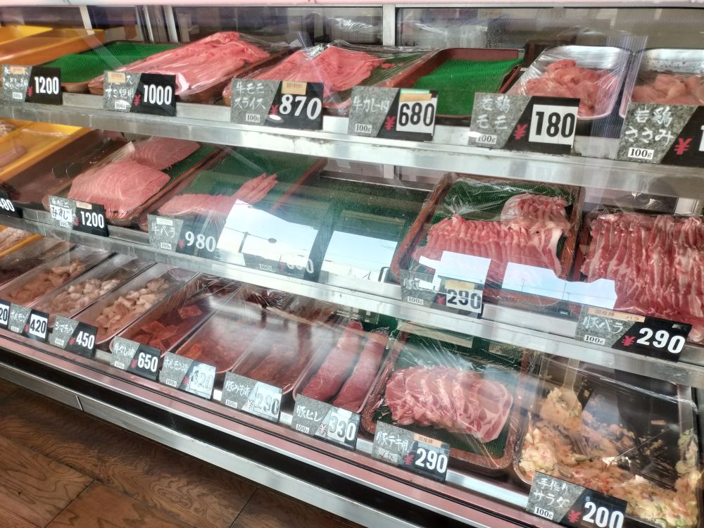 新鮮な精肉コーナーもあり、ミンチ、豚バラ、牛ロースなど幅広い種類が用意されています。