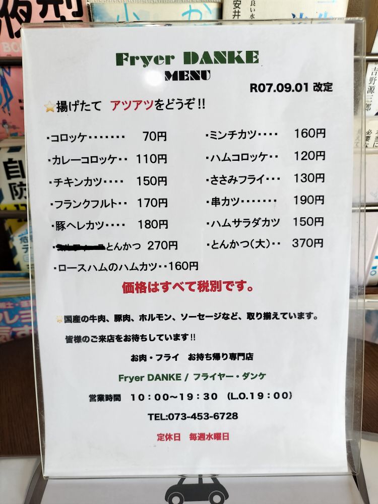 和歌山市善明寺の「フライヤーダンケ」は、地元で話題のお肉と揚げ物のテイクアウト専門店。サクサク衣のコロッケやハムカツなど、手作り揚げ物が70円から買える“安くて美味しい”人気店です。精肉も新鮮で、夕方には行列ができることも。和歌山でコスパ抜群の揚げ物を探すなら必見!