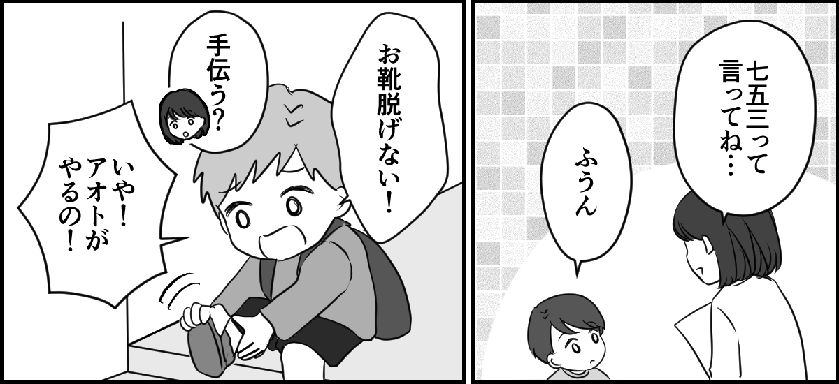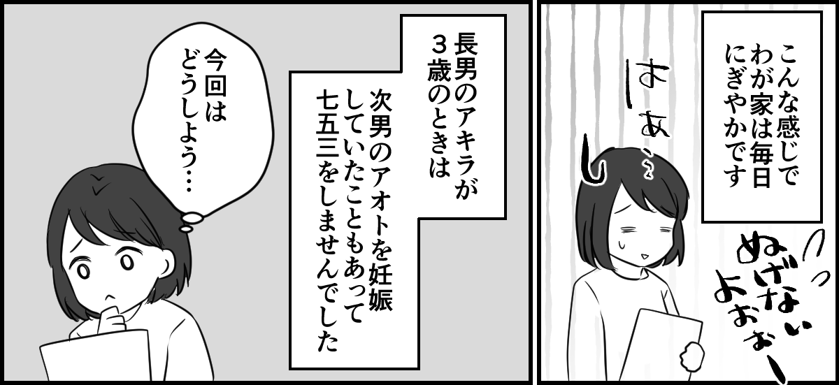 長男のアキラが3歳のときは、アオトを妊娠していたこともあって七五三をしませんでした。つわりやアキラの育児がしんどくて、それどころではなかったのです。 家のなかは散乱したおもちゃ、台所には食べ終わった食器が山盛り、布団のなかにもおもちゃ……。片付けてもすぐに散らかす、の繰り返しです。