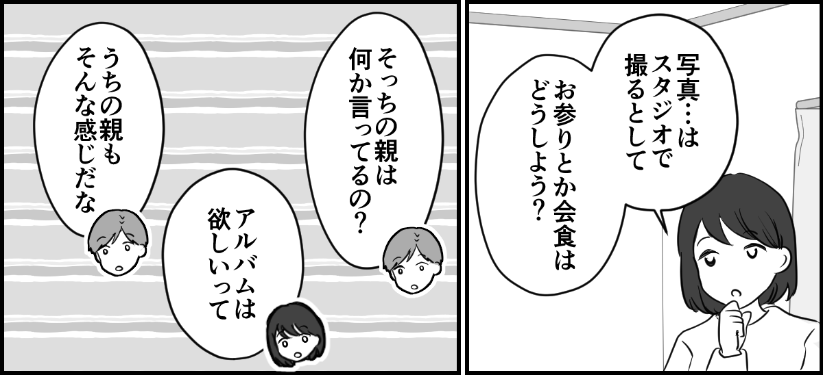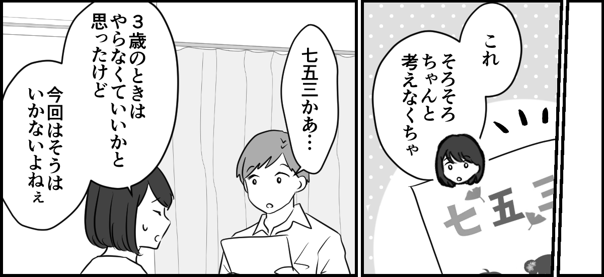 アキラとアオトがきっちりした衣装を着て、勝手な動きをせず、ちゃんとした写真を撮る。さらにお参り、だなんてとてもムリだと思いました。きっとグズって大泣き、私たち親はイライラ……。 「それもいい思い出」なのかもしれませんが、お祝いのイベントが近づくにつれて、重たい気持ちになるのはイヤでした。 幸い、両家の親も「家族で決めた、いい方法でどうぞ」と言ってくれました。 当日は写真スタジオで写真を撮ってもらうだけ。終われば遊園地のレジャーつき。かなり子どもメインで考えたプランとはいえ、これはわが家の最善策だと思っていたのですが…。 みなさんは、どんな七五三を迎えられますか?