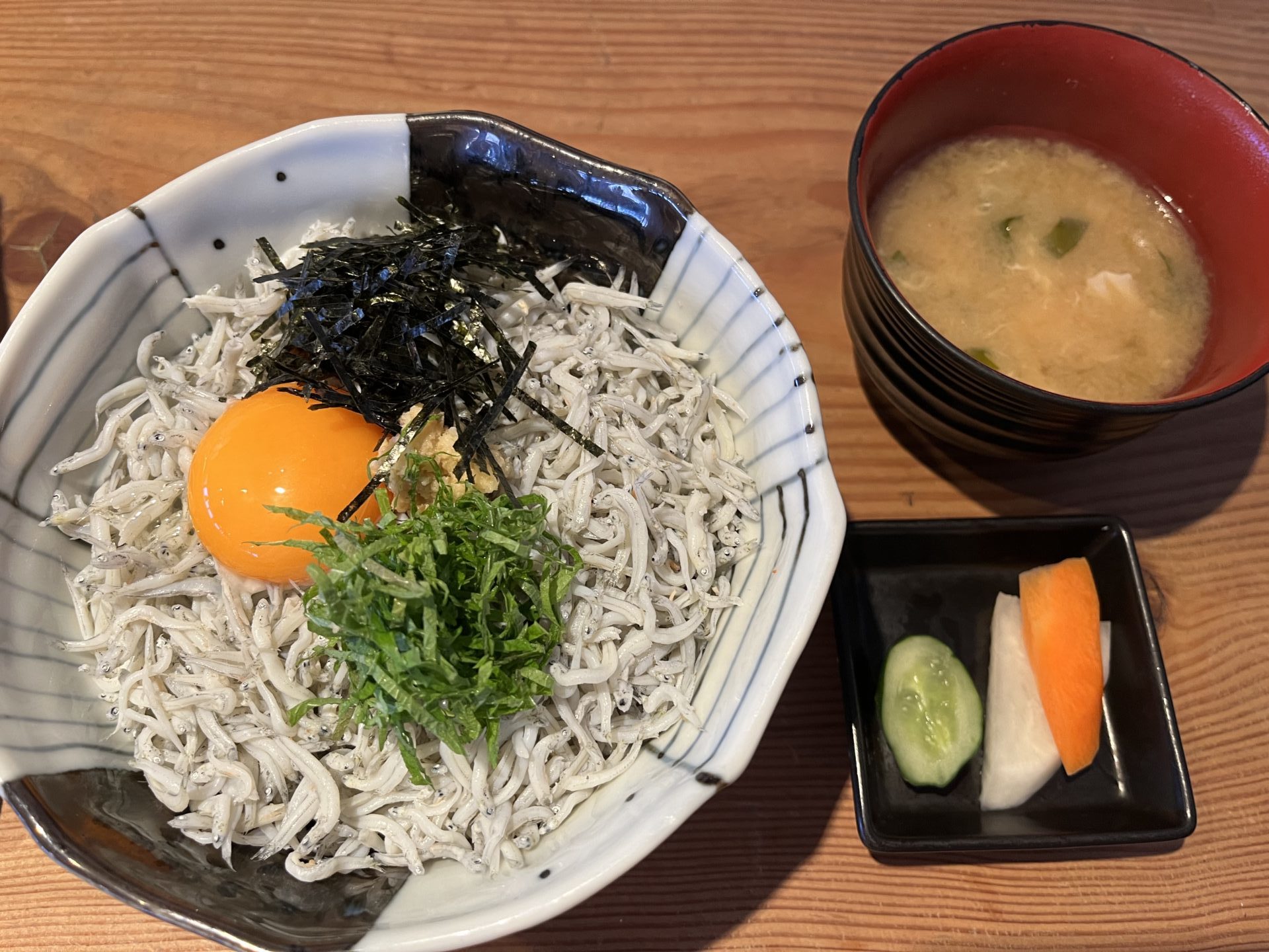 看板メニューの釜揚げしらす丼は、大葉や生姜の爽やかさと卵黄のまろやかさが絶妙。
