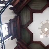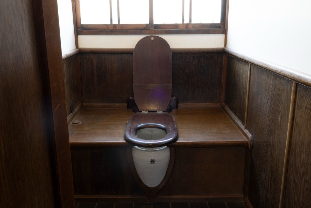 主屋には3つの階段があり、木屋町時代から残る座敷横の町家風の階段と、使用人用の急な裏階段、そして手すりまわりの洋風な東側の階段は大正期に増築されています。当時最新の建材だった合板(ベニヤ板)なども取り入れられ、そのそばに造られた2階のトイレは和式の便器を一段高く設置して、腰掛けて使える洋式風にしています。