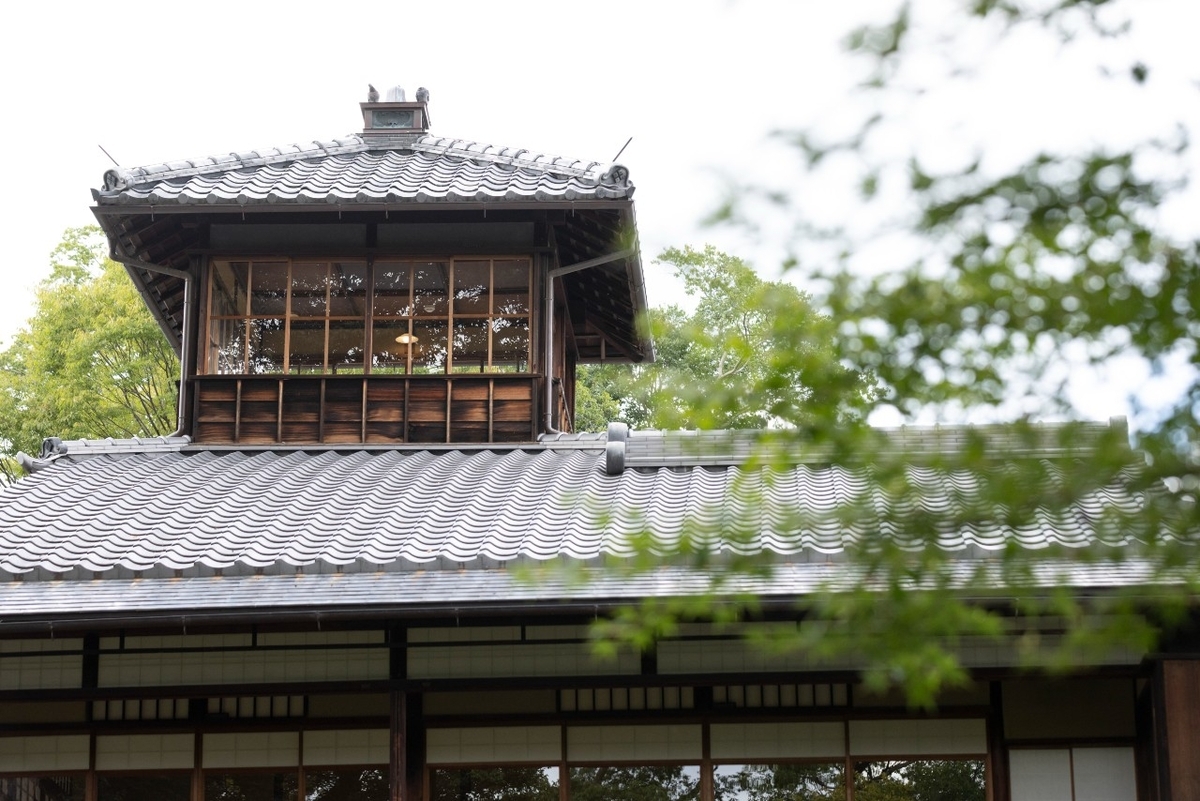 下鴨の地では、糺の森の一角につくられた広い庭に向けて建物の角度を約90度を変えて移築され、邸宅から庭を楽しむ一方、庭からも望楼を頂く建物の全景を眺める趣向になっています。