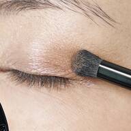 次に付属ブラシの毛の長い方でFを取り、手の甲でブラシになじませてから眉の上下にハイライトとして入れます。