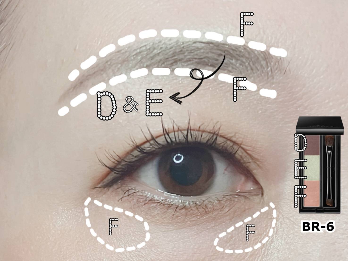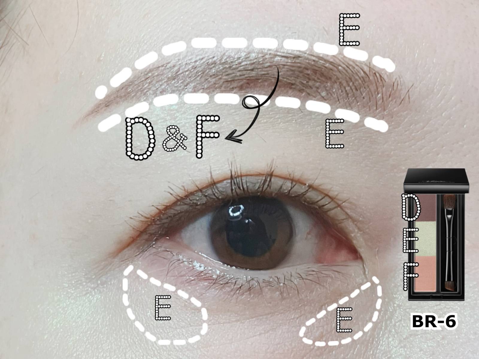 「Dのブラウンで眉を描いてEとFはどこに使うの?」と迷ってしまう方もいるかもしれません。