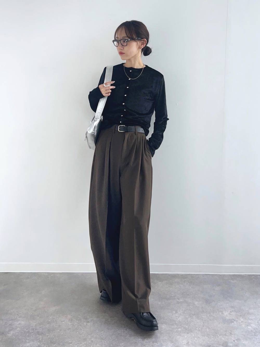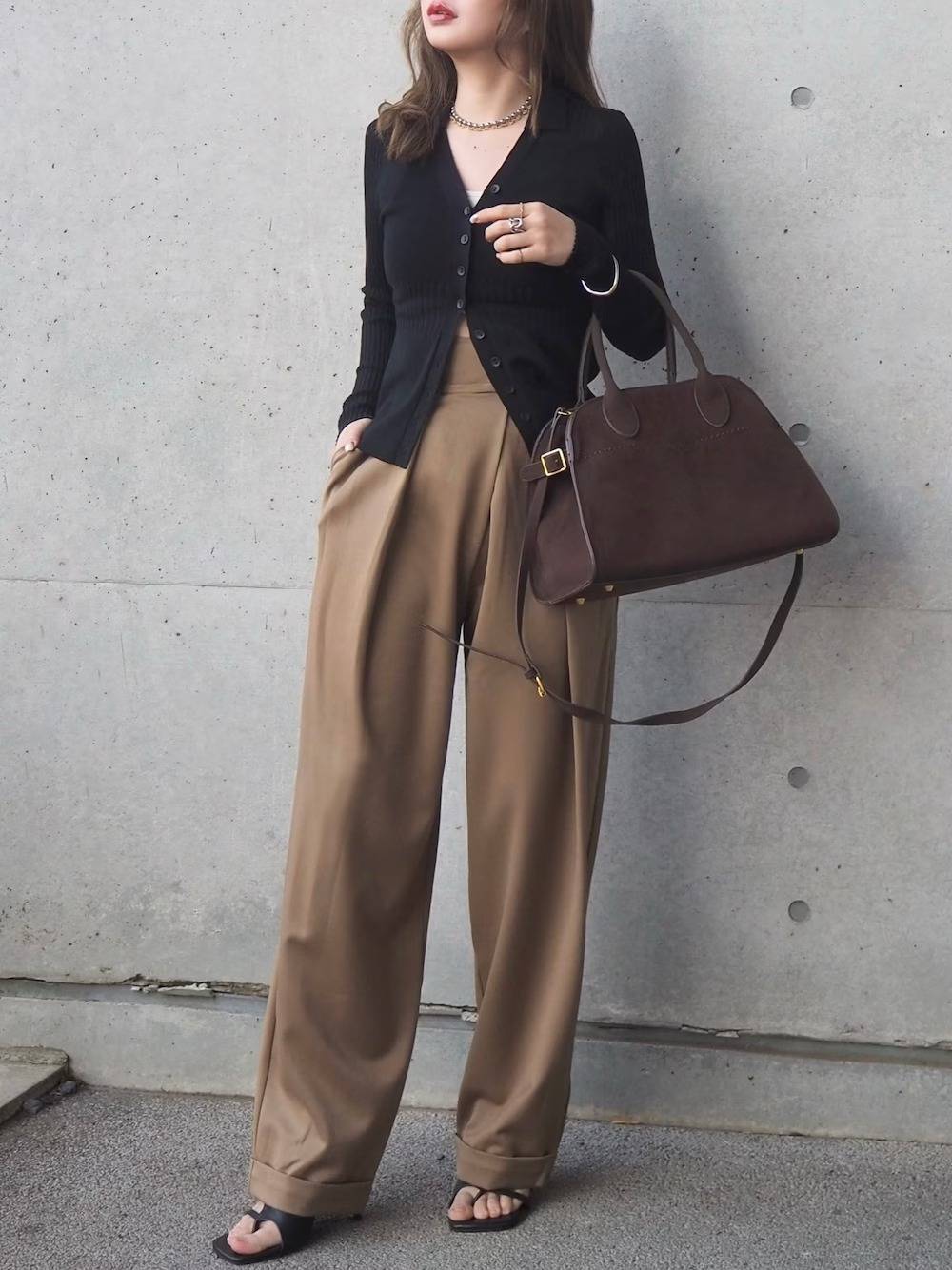 【初秋編】垢抜けるカーディガンコーデ③黒カーディガン×ブラウンパンツ