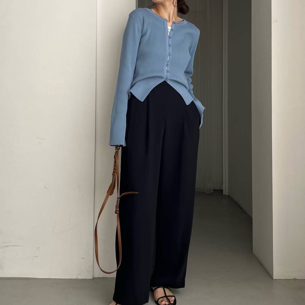【初秋編】垢抜けるカーディガンコーデ⑤ブルーのカーディガン×黒パンツ