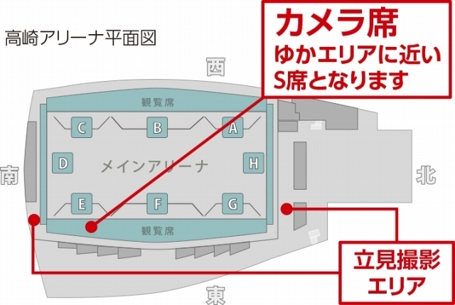 会場内のゆか競技エリアに近いS席の中にクラブツーリズム限定のカメラ席(S席)が用意され、そこからの写真撮影が可能となる。また、指定席とは別の「立見撮影エリア」でも撮影できる。