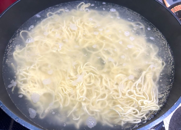 沸騰したお湯に麺をドボンし2、3分湯がく。汁は濃縮タイプなので水を加えて温め、器に移す。茹で上がった麺を湯切りし、汁の中に入れれば完成だ。
