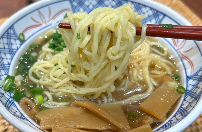 しょうゆの良い香りがフワッと漂い、もうそれだけで幸せな気分だ。麺は柔らか目でありながらモチっとした食感。ツルツルとした喉越しが気持ち良い。