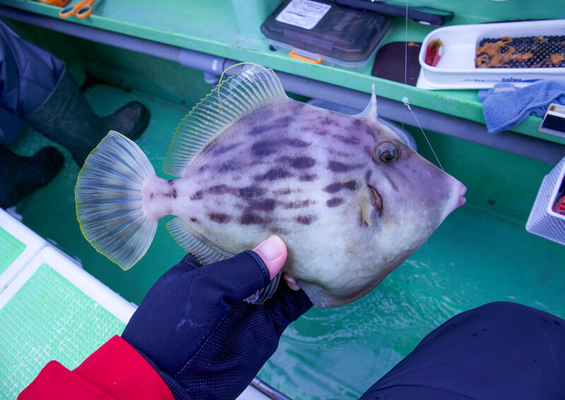 出船後、船がポイントに到着し合図があったら、仕掛を投入。仕掛が底に着いたら糸を張り、竿先に神経を集中します。カワハギは「エサ取り名人」と呼ばれるだけあり、アタリは繊細。ちょっとした竿先の震えをとらえ素早く聞きアワセるのがコツです。