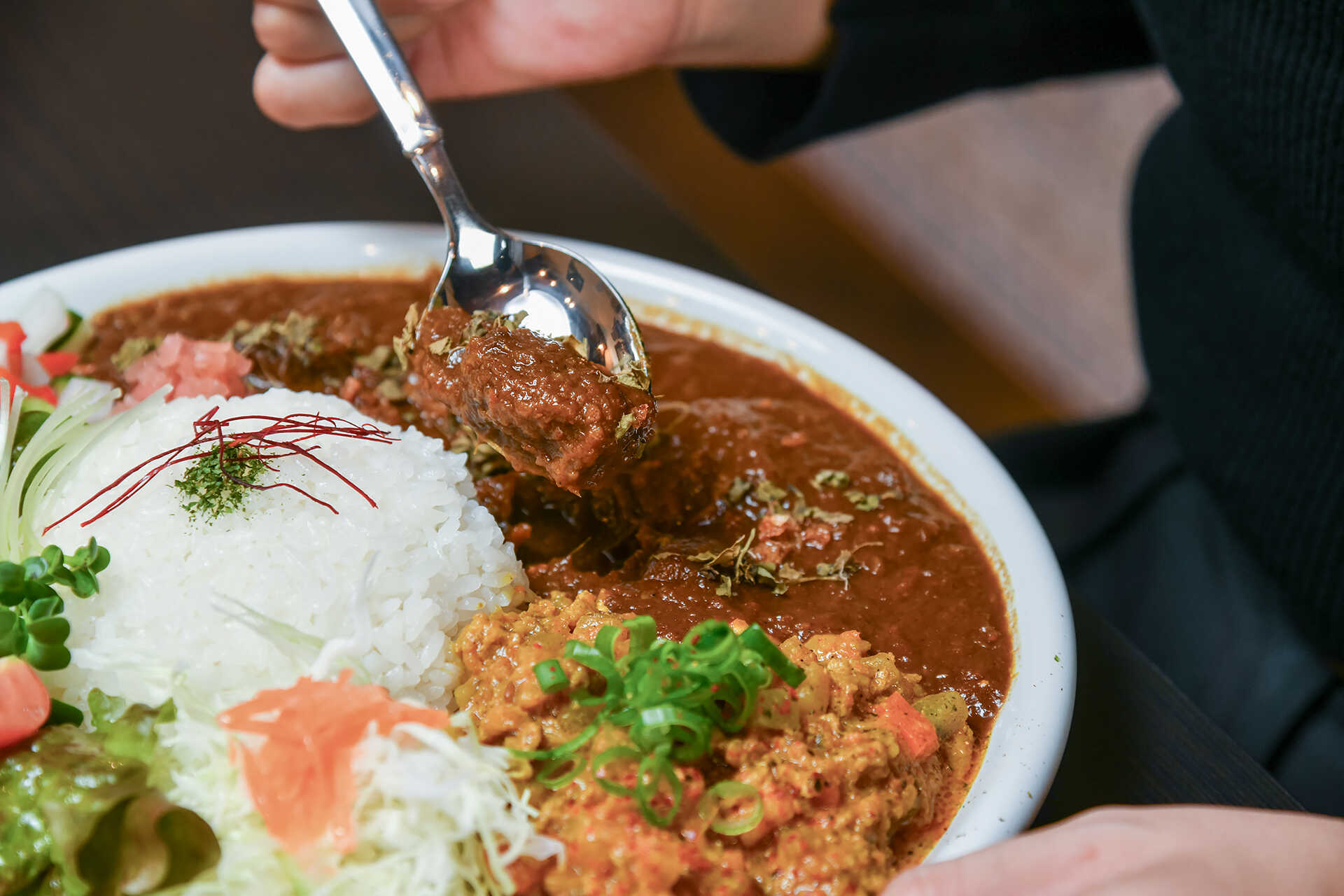 ルーに溶け込んだ野菜がやわらかなとろみを生み、食べ心地は軽やか。ひと口目から濃縮された野菜と牛肉の旨みが押し寄せ、赤身の黒毛和牛がゴロリと入ったボリュームは満足感も格別。やがてスパイスのシャープな刺激が追いかけてくるが、圧倒的な旨みがその角を包み込み、次のひと口へと誘う。気づけばもう、スプーンは止まらない。
