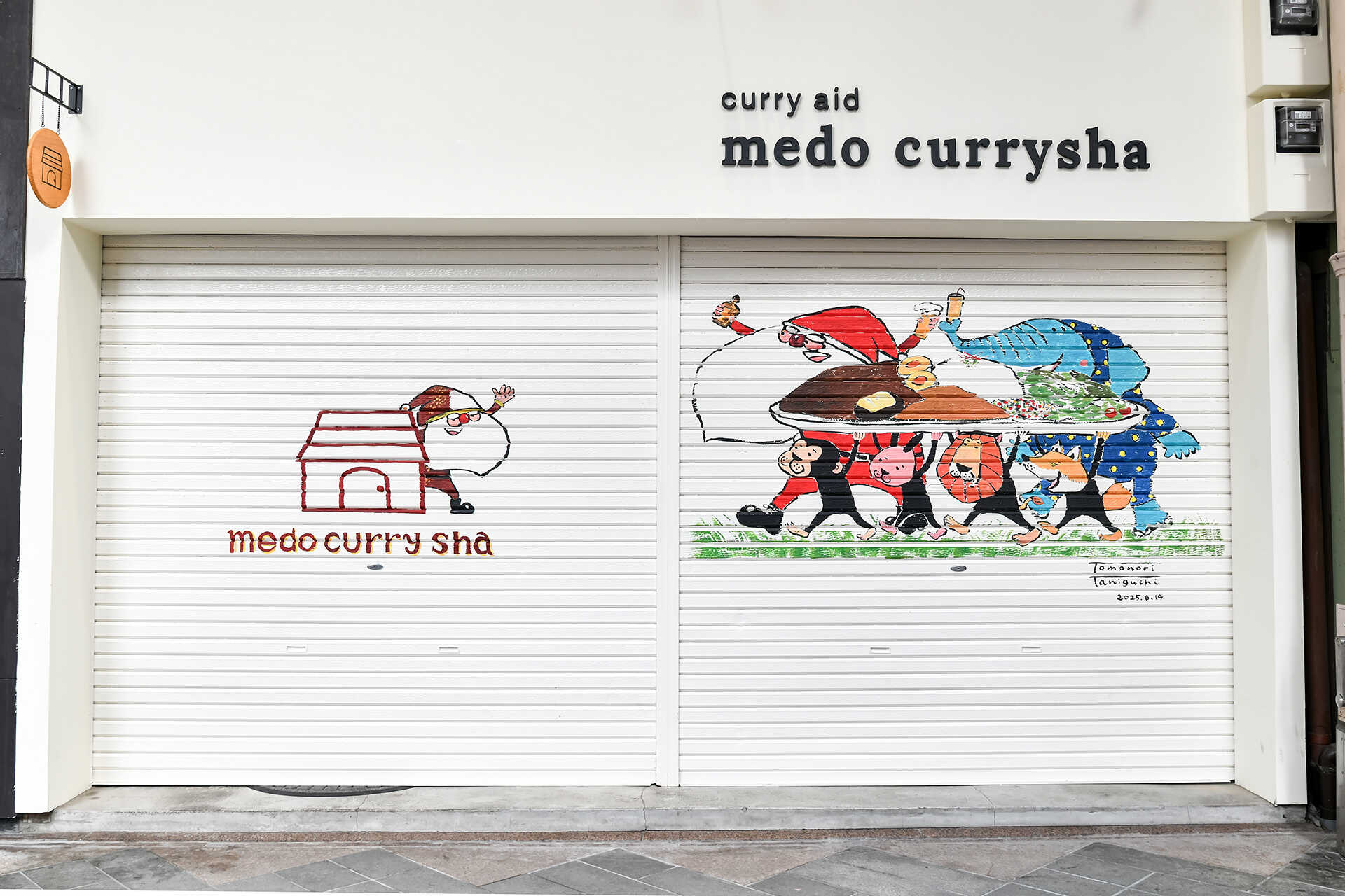 そしてこの店と切り離せない存在が、絵本作家の谷口智則さん。店主とは旧知の仲で、谷口さんが営む大阪のカフェ「ズーロジック」で間借りをしていた縁もある。店内には店主夫妻が「いつか自分の店に飾りたい」と大切にしていた絵がシンボルのように飾られ、シャッターには谷口さんによる直筆のイラストが描かれている。この店のために谷口さんが作ってくれたというキャラクター“カレーサンタ”と店のロゴのコラボレーション、動物たちが「メドカレー舎」のあいがけカレーを運ぶ姿など、ここでしか見られない貴重な作品。閉まっている時間帯も、商店街を明るく彩っている。