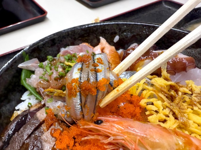 ……が、結果的にはメガ海鮮丼を瞬殺! この日はタイ・ブリ・カツオ・アジ・サーモン・きびなご・タコなどが乗っていたが、どれも新鮮で激ウマ!! ブリはコリコリどころかゴリゴリですわ!