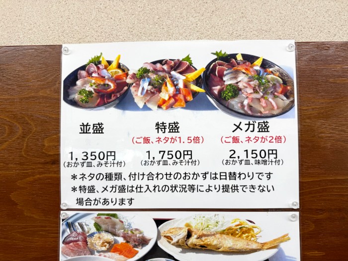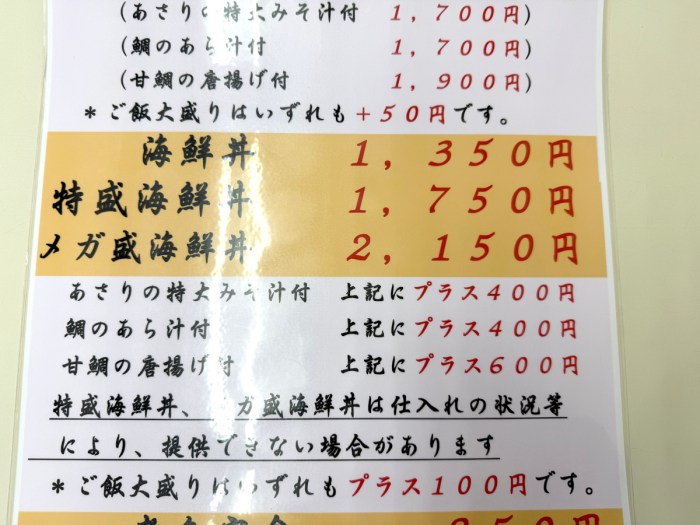 その場合、泣く泣くカツカレーを食べるハメになっていたが、これで一安心。お目当ての「メガ海鮮丼(2150円)」に「鯛のあら汁(400円)」を付け、しばし料理が到着するのを待った。
