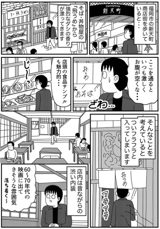 福岡市中央区天神・新天町のアーケードを歩いていると、ふわっと漂ってくるあの香り。思わず足を止めてしまうのが、老舗の蕎麦屋「飛うめ」。昔ながらの佇まいに誘われて、入店してみると…。