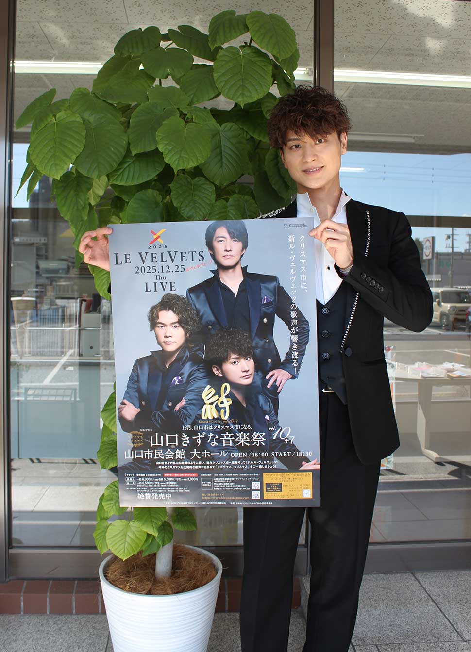 同グループからは、佐賀龍彦が病気療養のため昨年9月末に脱退。今年から、佐藤隆紀(テノール)、日野真一郎(テノール)、宮原浩暢(バリトン)の3人で活動している。全員が身長180センチ以上かつ音楽大卒の実力派。音楽評論家で作詞家の湯川れい子さんが命名したグループ名は、上質でなめらかな生地「Velvet」(ヴェルヴェット)に由来しており、クラシックはもちろん、ロック、ポップス、ジャズ、果ては民謡に至るまで、さまざまなジャンルを自在に表現。舞台やミュージカルなど、メンバーそれぞれがソロでも活躍中だ。先日、メンバーの日野さんが、音楽祭のPRにサンデー山口を訪れた。