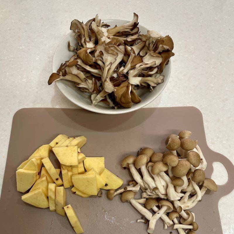 舞茸としめじは石づきを取り、食べやすい大きさにほぐしましょう。