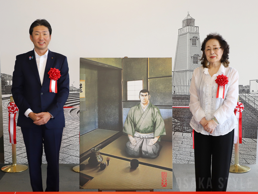 当日は永藤英機堺市長や、さいとう・プロダクションの齊藤輝子社長らが登壇。茶の湯を意識した和装姿のゴルゴ13のオリジナルイラストと、千利休作の茶室で唯一現存する国宝「待庵」を創建当初の姿として想定復元した「さかい待庵」の写真を合成したオリジナル作品が初公開された。