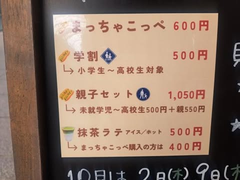まっちゃこっぺの値段は本来600円なのですが、学割、親子セットなどのお得な割引もあります。学割(小学生~高校生) 500円親子セット(未就学児~高校生+親) 2個で1050円※まっちゃこっぺと抹茶ラテ同時購入だと、抹茶ラテを100円引き。(まっちゃこっぺと抹茶ラテで合計1000円)