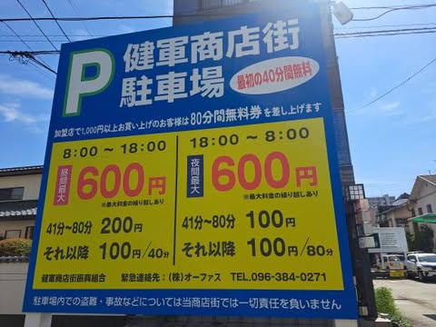 最初の40分は駐車料金無料です。 40分以降も加盟店で1000円以上お買い上げで80分間無料券ももらえますので、1000円以上買い物した際は必ずお店に駐車券を提示しましょう。