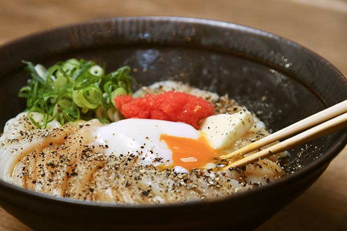 手打ちしたうどんの上に、温泉卵とネギ、明太子、バターをトッピング。さらに四国の海沿いで愛される甘い醤油をたらりと回しかけ、ブラックペッパーをガリガリガリとた~っぷり挽いてサーブする。温泉卵を箸で割り、少しずつ溶けていくバターと混ぜて啜れば、明太子とブラックペッパーの刺激がマイルドに。明太子やネギの風味、バターのコク、温泉卵のまろやかな味わい、生醤油の香りが渾然一体になってうどんに絡まり、啜るほどにハマっていく。