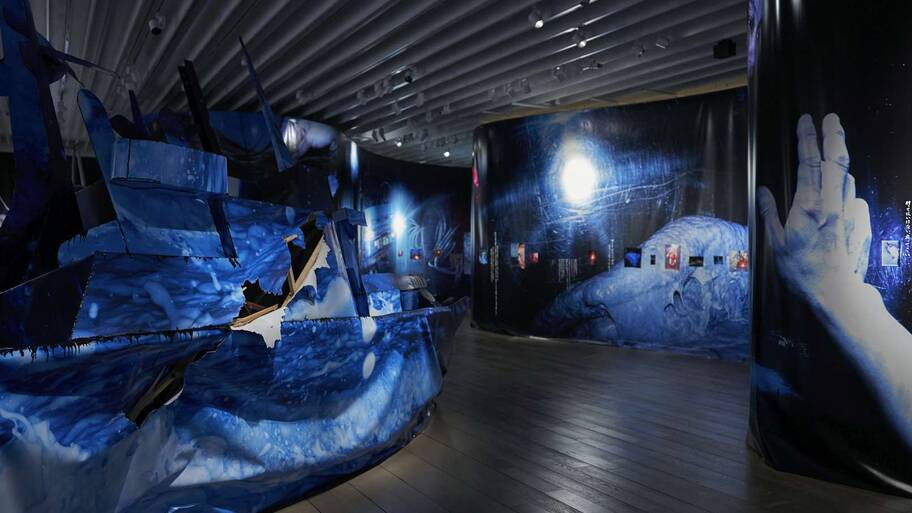 展覧会は大まかに、二つのゾーンからなる。年代別にジブリ作品をたどるパネル展示ゾーンと、「風の谷のナウシカ 王蟲の世界」と題した大型の造形物が並ぶゾーンだ。既存の展示ケースは使わず、可動式の壁を複雑に組み合わせて観覧コースを作っている。展示室に入ると、ここが静岡県立美術館であることを忘れてしまうだろう。