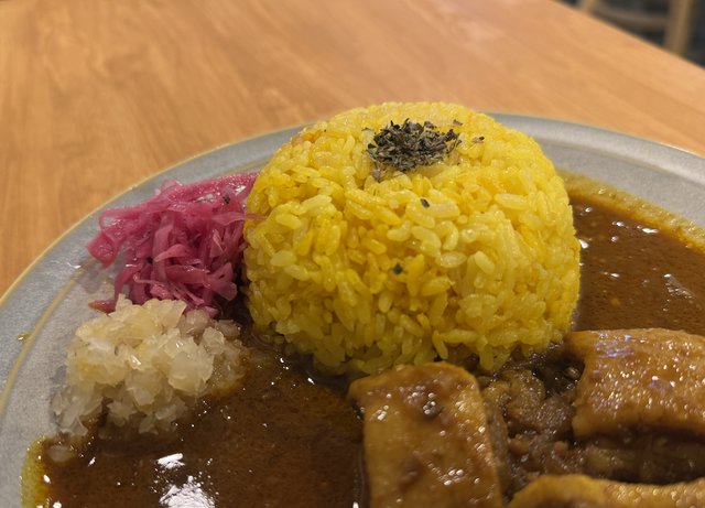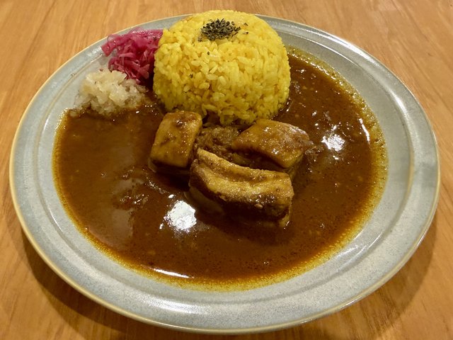 サフランライスに欧風カレーがかかり、豚バラブロックがゴロッと豪快にのっています。