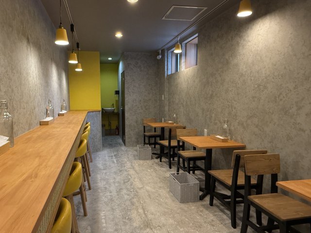 店内はスタイリッシュで奥行きがあり、カウンター席と2人掛けのテーブル席を用意。カレー店らしく、黄色がアクセントカラーとして使われています。