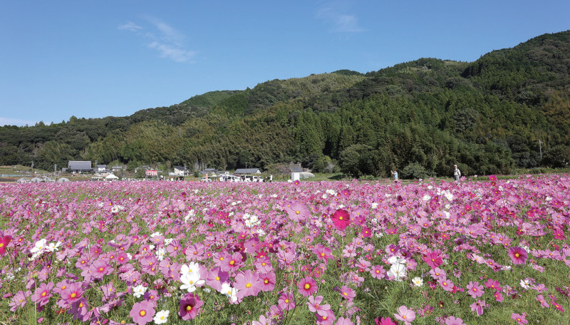 住民が育てた約3万平方メートルの休耕田に、ピンクや赤のコスモスが咲きはじめてきました。見頃は中旬からの見込み(10/3現在1〜3分咲き)。10月11日には「コスモス祭り」のオープニングイベントが開催。見頃時期にはコスモス狩りや地元野菜の販売を実施します。