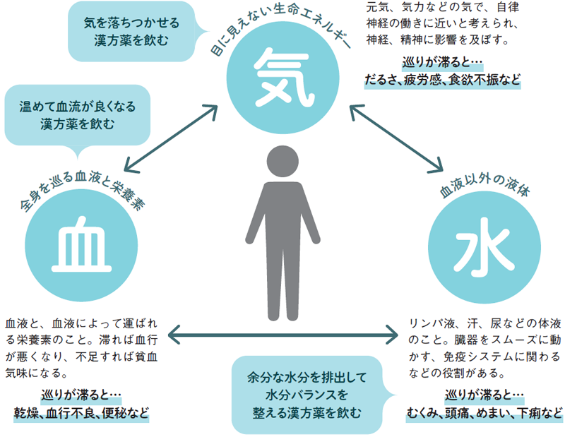 睡眠の悩みを抱える人には「漢方」によるアプローチも可能です。漢方医学では、不調の原因は生命活動を支える「気・血・水」のバランスの乱れにあると考えます。そのバランスの乱れが一人ひとりの体質や症状として現れた状態を「証」と呼び、そして病気がどの段階にあるかを「六病位」という6つのステージで判断します。これらの診断基準を総合的に用いて、その人に適した漢方薬を選んで行くのです。