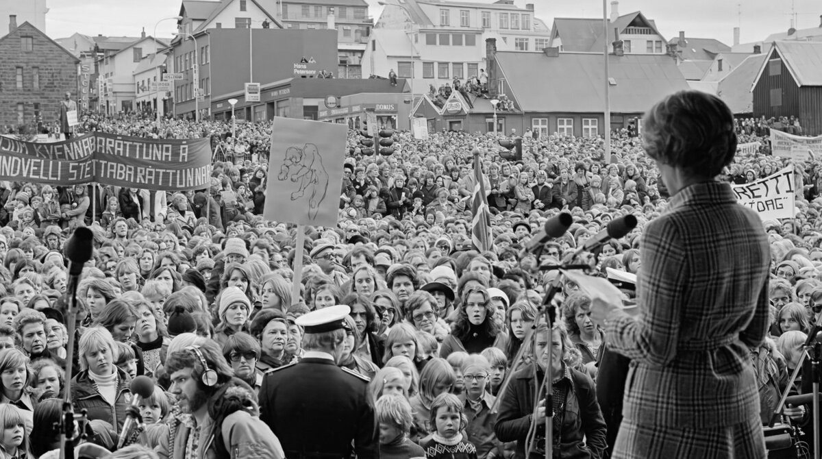 1975年6月にアイスランドの各地からおよそ300人の女性が集まり、女性会議。格差を解消するためには、どうすればいいのかを話し合った末にその年の10月24日に一斉に仕事や家事を休む、事実上のストをしようと。