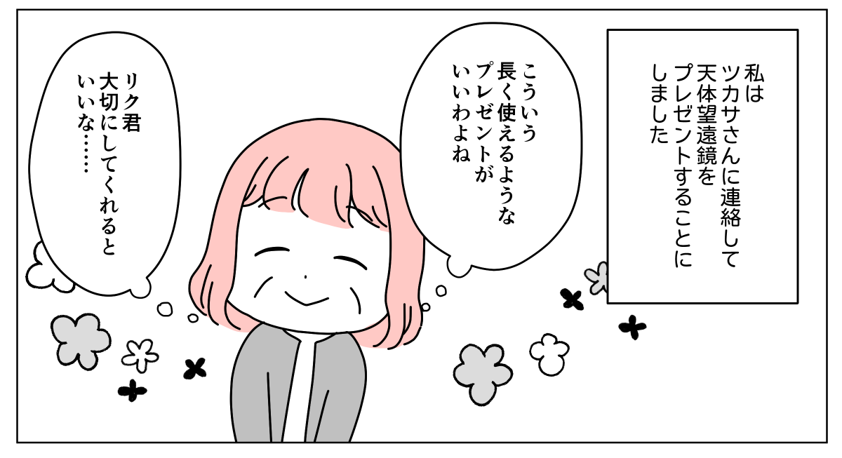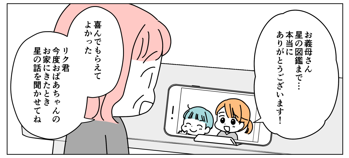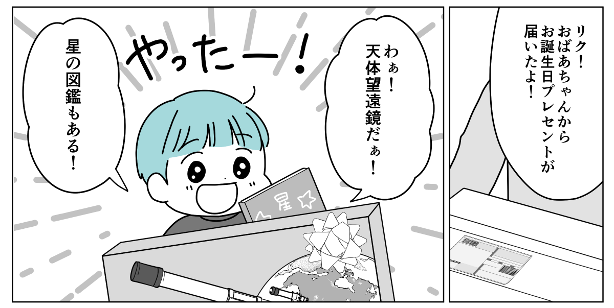 プレゼントは本人がほしがるものが一番。だから漫画を贈ってもきっと喜んでもらえたのでしょう。けれど私があげたい誕生日プレゼントとは少し違ったのです。天体望遠鏡と星の図鑑を贈ると、リク君からお礼のビデオ通話がありました。