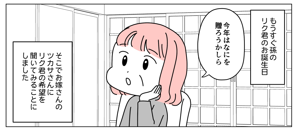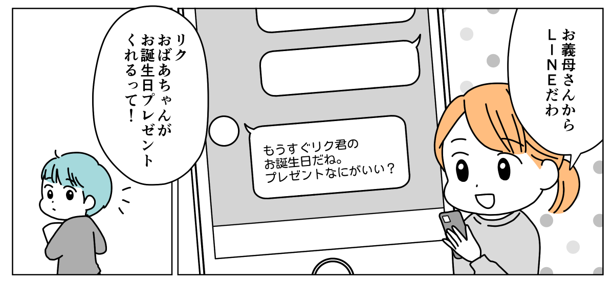 私はツカサ。夫と小5の息子リクと3人で暮らしています。もうすぐリクの誕生日。遠方に住む義母から「誕生日プレゼントのリクエストを聞かせてほしい」と連絡がありました。義実家へは家族3人で年2回ほど帰省しており、そのたび義母はよくしてくれます。リクのこともとても可愛がってくれ、小さい頃から誕生日には子ども服や絵本などを頂いていました。ここ数年はリク本人がほしいものを伝え、地球儀や腕時計といった品物をプレゼントしてもらっています。