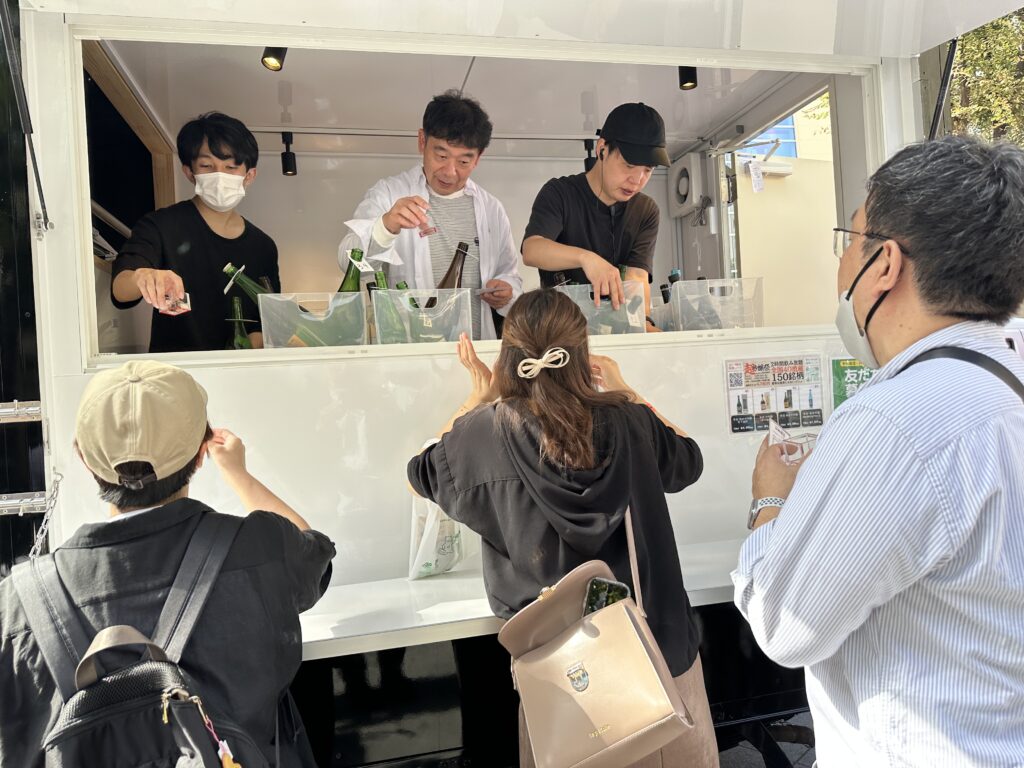 各酒蔵ブースでは、蔵元と直接会話しながらお酒を選び、ブースで受け取ったお酒カードをもとに、背後のキッチンカーでお酒を注いでもらうスタイル。