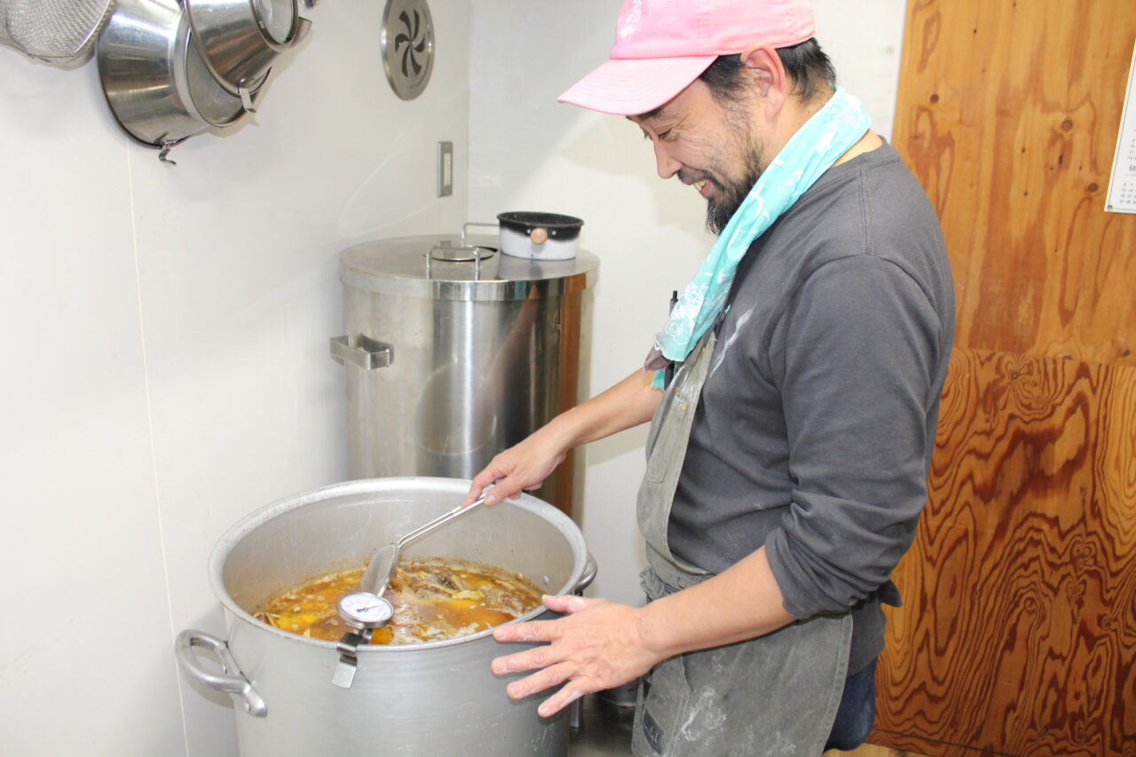 営業開始は10時ですが、毎朝5時頃から製麺やスープ作りなど準備を始めるそうです。こちらの製麺機は、東京から一緒に引っ越ししてきたそう。できあがった麺を一束一束見つめるまなざしが真剣です。