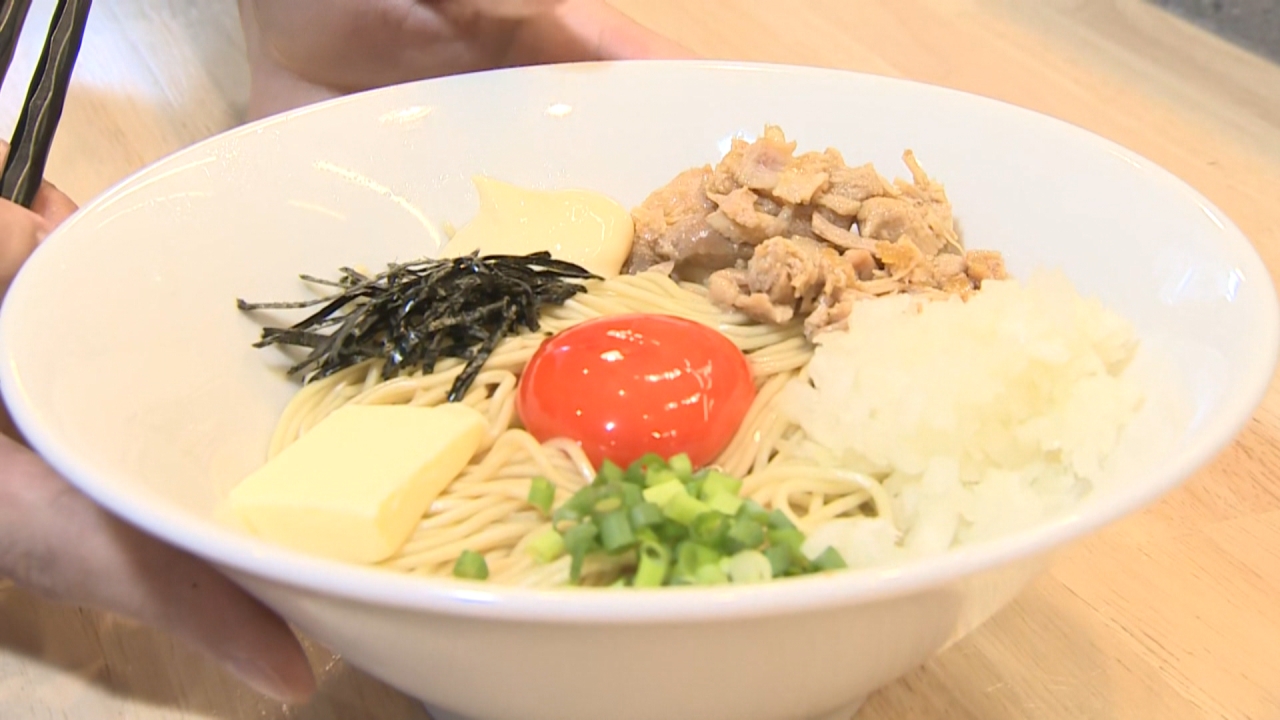 よく混ぜ合わせることで鶏チャーシューの旨み、たまごとバターのコクが麺に絡み、アクセントの玉ねぎや海苔が味に奥行きをプラスしてくれます。