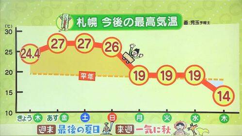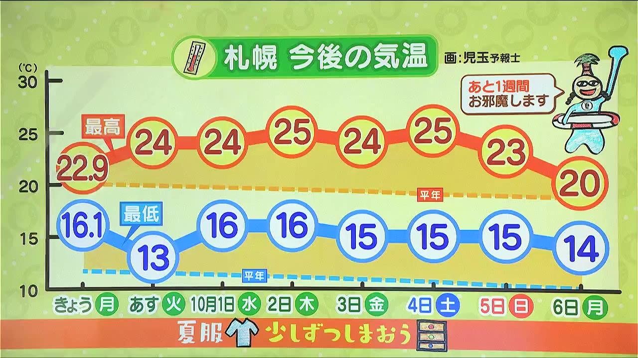 今後の札幌の予想気温です。最高、最低とも平年より高く、10月に入っても木曜、土曜と25度の夏日になりそうです。
